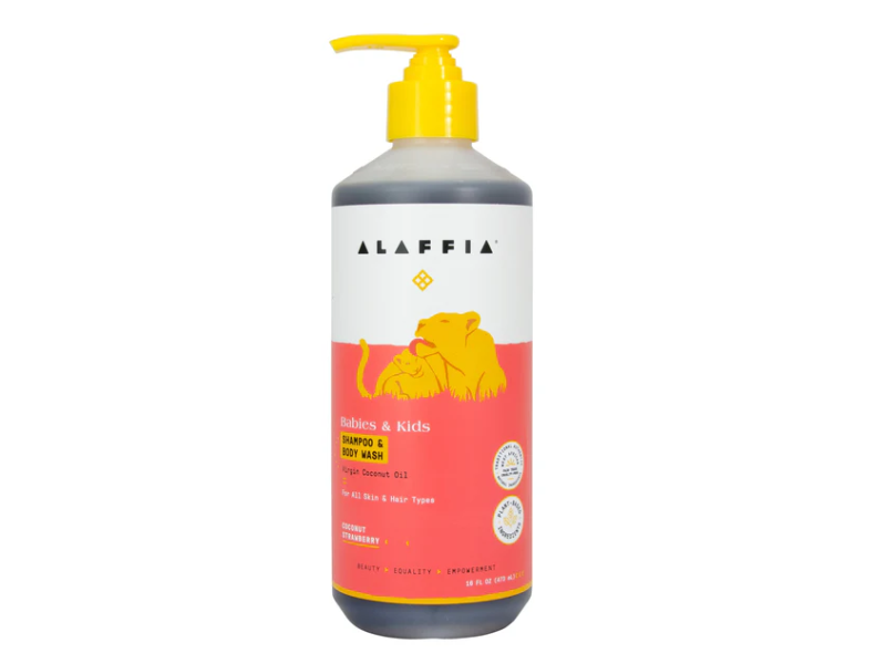 Alaffia’s playful coconut strawberry shampoo & body wash, prepared with Ethically Traded virgin coconut oil, strawberry and hibiscus that is gentle and non-irritating for EveryDay clean