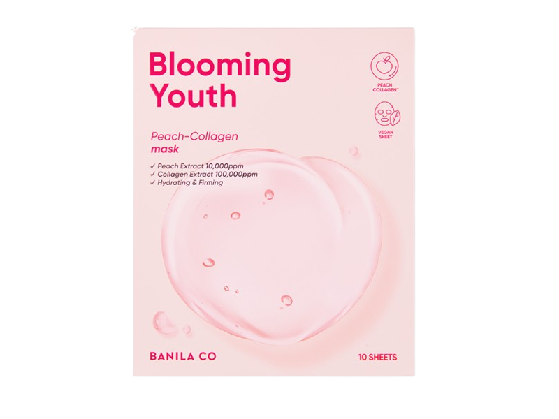 The Blooming youth Peach Collagen Mask help to slow aging of your skin. It contains 111,000ppm of peach collagen, which is effective for skin elasticity and the firming essence is absorbed into the skin without stickiness so you can use one sheet mask a day.