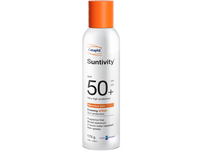Cetaphil Suntivity SPF 50+ Foaming Spray is a sunscreen suitable for sensitive skin. The lightweight formula contains vitamin E and glycerin to nourish the skin, and is free of oil, parabens, alcohol and fragrance. The lightweight foam glides on easily without leaving any sticky residue. It offers four hours of water resistant, broad spectrum sun protection.