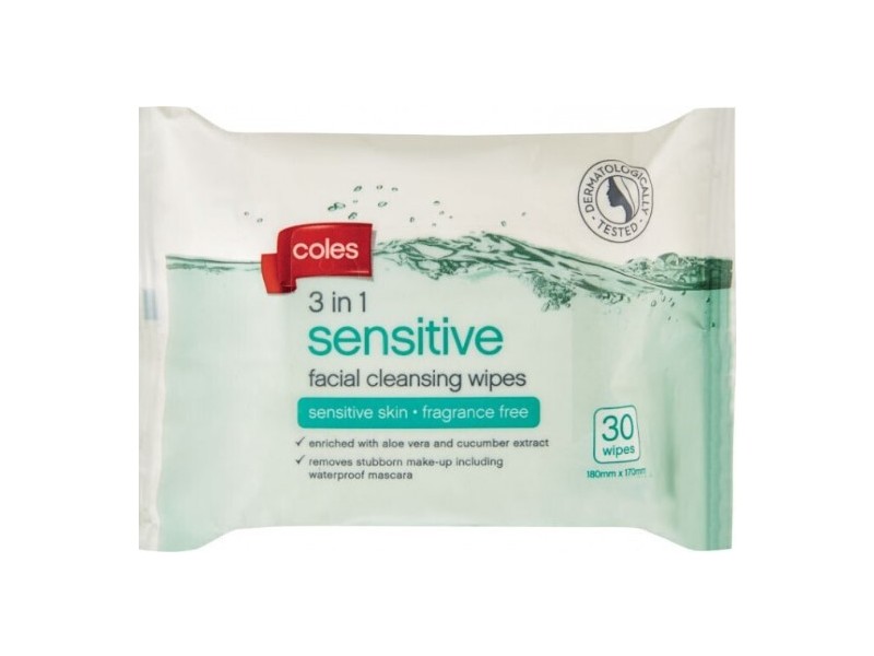 Coles Biodegradable Sensitive 3 In 1 Facial Cleansing Wipes, Fragrance Free, 30 Wipes