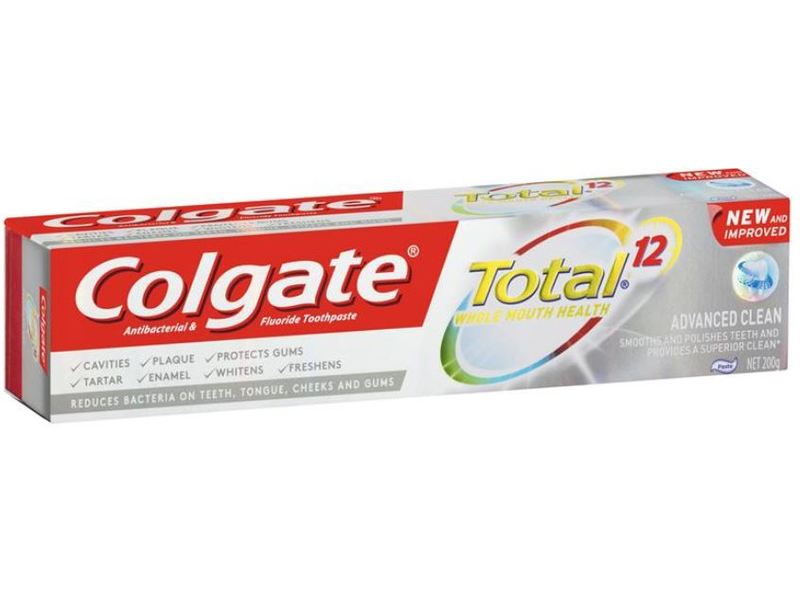 Colgate. New breakthrough technology for whole mouth health. Fights bacteria on teeth, tongue, cheeeks, gums for 12 hours.