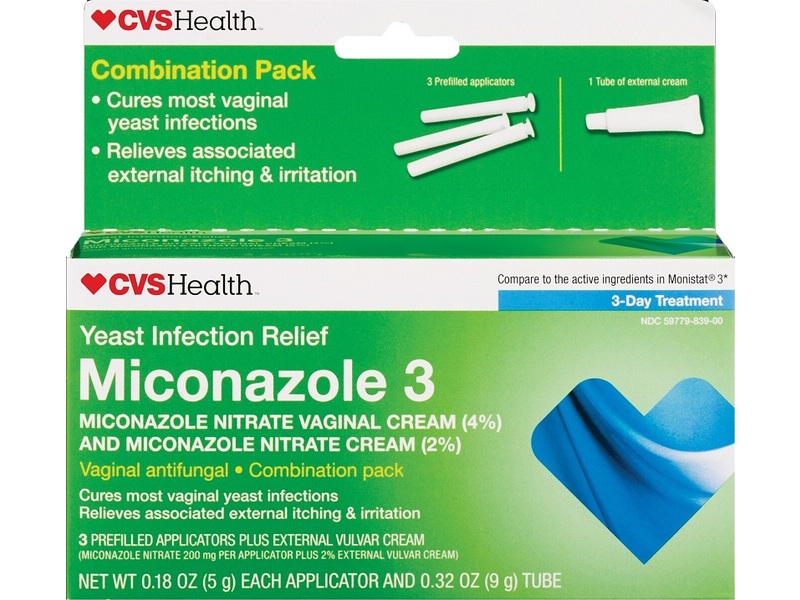 Miconazole Nitrate Vaginal Cream (4%) and Miconazole Nitrate Cream (2%) is a 3-day yeast infection treatment that cures most vaginal yeast infections and relieves external vulvar itching and irritation associated with a vaginal yeast infection. Includes 3 pre-filled applicators and cream.