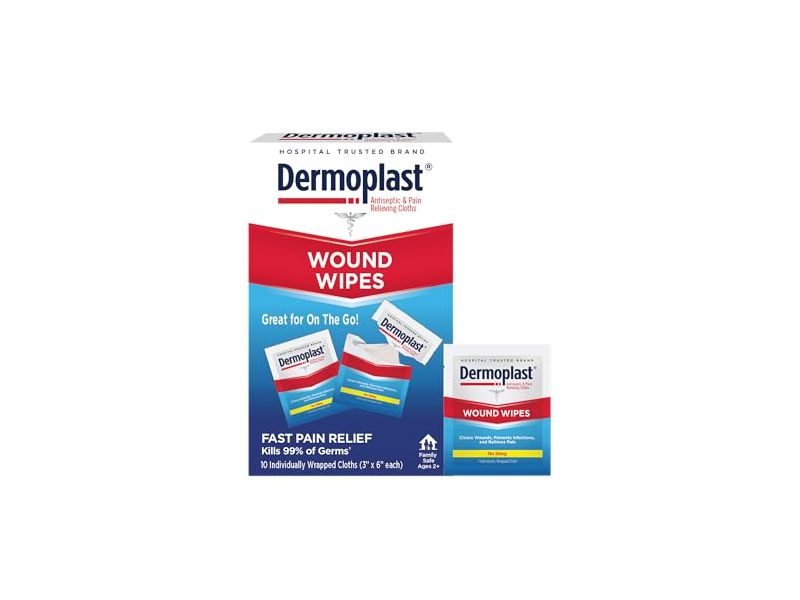 These super portable wipes pack all the pain relief benefits of Dermoplast, making them perfect for scrapes, cuts, and more. Infused with soothing aloe and a no-sting antiseptic formula, wipes not only clean wounds and prevent infection but also provide instant pain relief.