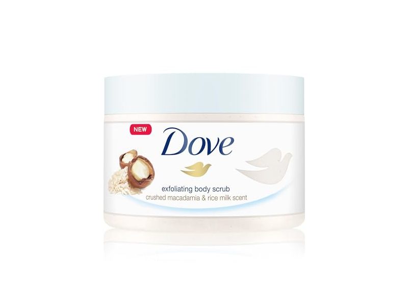 Dove Crushed Macadamia & Rice Milk Body Scrub, which gently exfoliates to reveal smooth, radiant, & nourished skin. Ideal for removing dull skin.