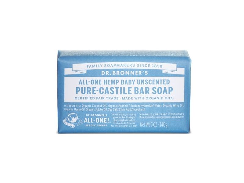 With no added fragrance and double the olive oil, our Baby Unscented Pure-Castile Bar Soap is good for sensitive skin – babies too (though not tear-free!). Dr. Bronner’s Bar Soap is made with certified fair trade ingredients and organic hemp oil for a soft, smooth lather that won’t dry your skin. 100% biodegradable in a 100% post-consumer recycled wrapper.