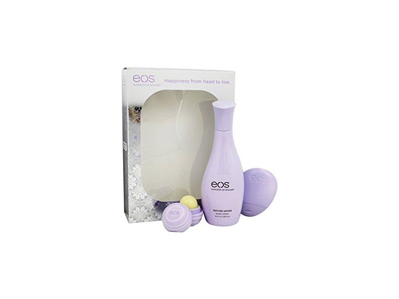 Eos Evolution of Smooth Body Lotion Gift Set includes Delicate Petals Body and Hand Lotion and Lip Balm Sphere Blackberry Nectar. Eos body lotion goes on like sheer silk, while still providing your skin with all the moisture it needs. It absorbs quickly, leaving barely a trace on skin - while providing 24 hours of long-lasting moisture. Enriched with natural shea butter, avocado oil and vitamin E and with elegant, a light refreshing scent, your skin will be visibly softer and look and smell great. Eos Lip Balm, enriched with natural conditioning oils, moisturizing shea butter and antioxidant vitamins C & E, nourishes for immediately softer, more beautiful lips. With Eos Gift Set you will experience happiness from head to toe.
