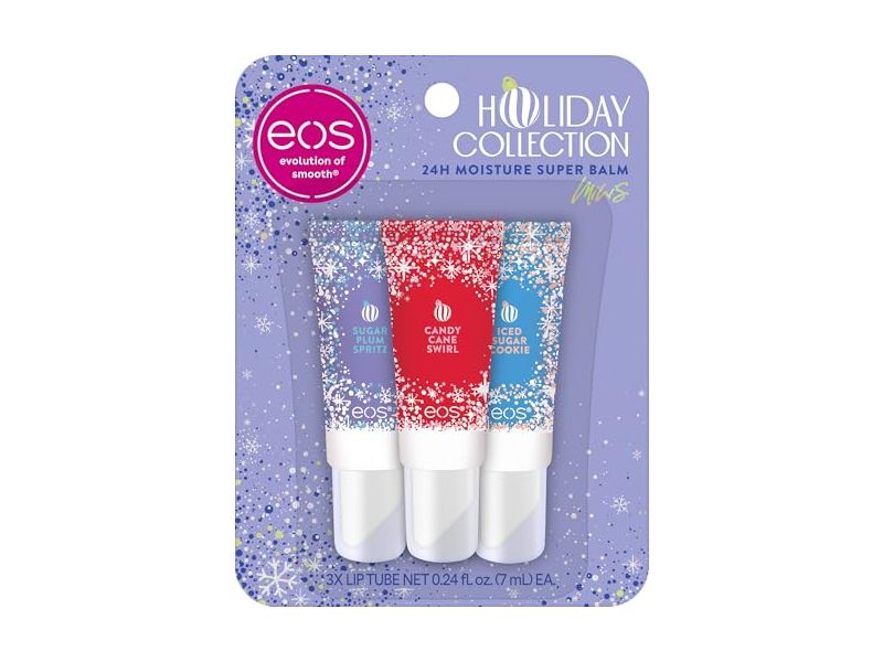 eos Holiday 24h Moisture Mini Super Lip Balm Set, Sugar Plum Spritz, Candy Cane Swirl, Iced Sugar Cookie, 0.24 fl oz/7 mL, Pack Of 3