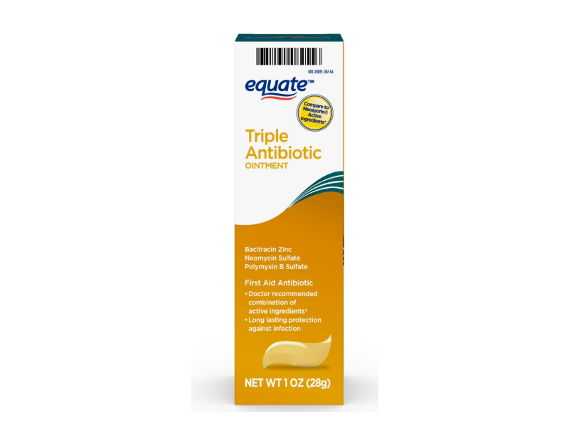 Equate First Aid Triple Antibiotic Ointment provides long-lasting, 24-hour infection protection for minor cuts, scrapes and burns. This original strength ointment helps skin heal, resulting in healthy looking skin. Contains bacitracin zinc, neomycin sulfate and polymyxin B sulfate