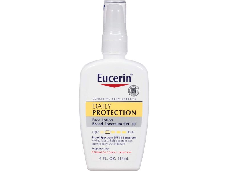 Eucerin’s Daily Protection Face Lotion is a dermatologist recommended, lightweight, broad spectrum SPF 30 moisturizer. Eucerin Daily Protection Face Lotion has UVA/UVB sunscreens, including zinc oxide and titanium dioxide which helps defend against sunburn and long-term sun damage. In addition, it provides 24 hour moisture, is non-comedogenic and is clinically proven to be gentle on sensitive skin.