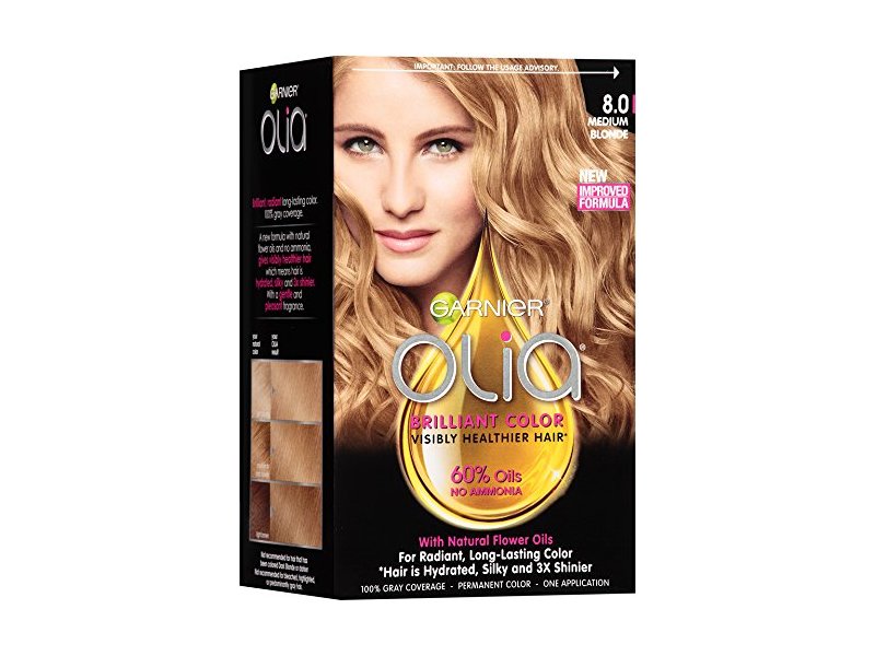 Garnier Olia shade 8.0, "Medium Blonde," is a natural blonde shade that will allow your natural tones to show through and will provide 100% gray coverage. Shade 8.0 is best for anyone with natural hair between light blonde and light brown. If you would like a lighter shade that still reflects naturally, shade 9.0 might be for you.