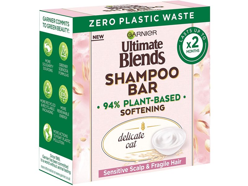 Garnier Ultimate Blends Delicate Oat Softening Shampoo Bar suitable for a sensitive scalp & fragile hair. Delicate Oat Solid Shampoo Bar is blended in a gentle recipe, with sustainably sourced ingredients, including Oat Milk & Rice Cream to nourish & soften hair.