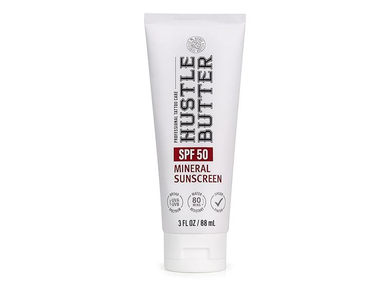 Tattoo sunscreen lotion uses non-nano zinc oxide, a physical barrier that sits on the skin to block UVA/UVB rays without penetrating or irritating tattoos. This helps prevent fading, discoloration, or damage to tattoo ink caused by sun exposure.