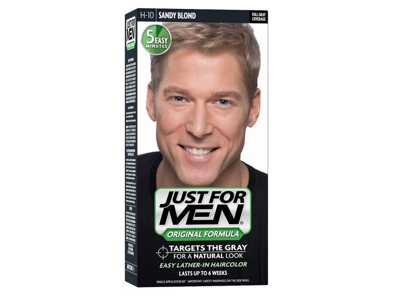 Just For Men targets only the gray hair.  Helps replace it with subtle tones that match your natural hair color.  Easy as shampooing - works in 5 easy minutes.  Helps rejuvenate hair:  Helps leave hair thicker and fuller-looking.  No damaging ammonia.  Lasts until the gray grows back.