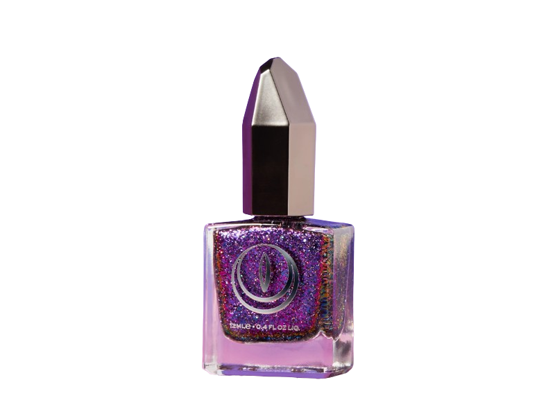 SUPERVILLAIN is a multichrome flakie lacquer filled with holographic glitter that shifts between shades of blue and purple.