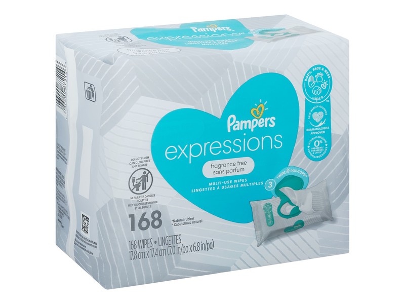 Pampers can be used on body, face, messes, surfaces, and more. Expressions Wipes are gentle enough for faces, yet durable enough to take on tough messes.
