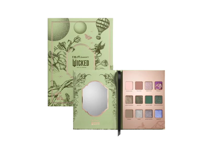 The r.e.m. beauty x Wicked ozdust eyeshadow palette captures the icy blue crystal tones, playful pinks, and powerful greens from this captivating scene.