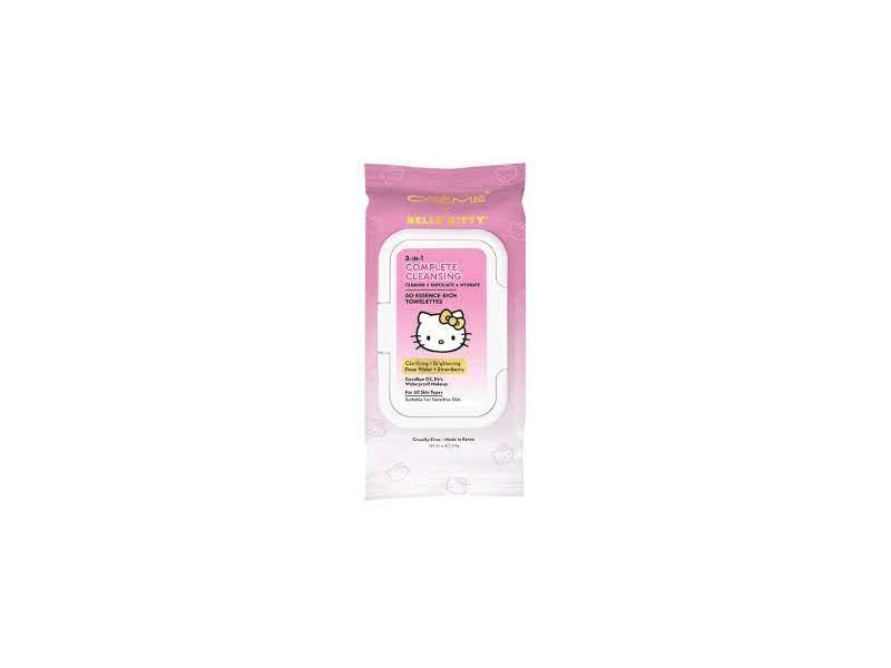 The Crème Shop Hello Kitty 3-in-1 Complete Cleansing Essence-Rich Towelette Facial Wipes. Cleanse, exfoliate, and hydrate skin in a swipe! With clarifying Rose Water and Strawberry, these towelettes help remove impurities from face and body.