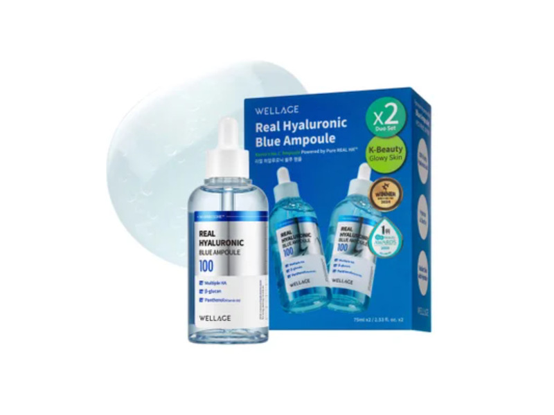 Real hyaluronic blue ampoule deep hydration for the skin. Wellage's unique patented hyaluronic acid HA-Aminosome real HATM watery formula.