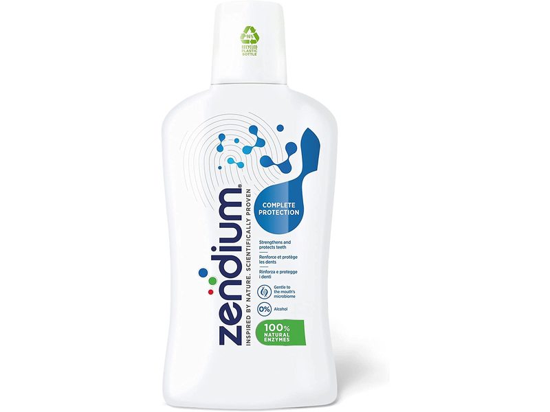 Zendium Complete Protection mouthwash contains natural antibacterial enzymes and proteins to boost the mouth's natural defences. 0% alcohol. 0% SLS